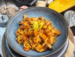 Rezepte VegetarischCremiger Butternut-Kürbis mit Champignons und Bandnudelnvon PetraHinterlasse einen Kommentar zu Cremiger Butternut-Kürbis mit Champignons und Bandnudeln