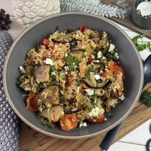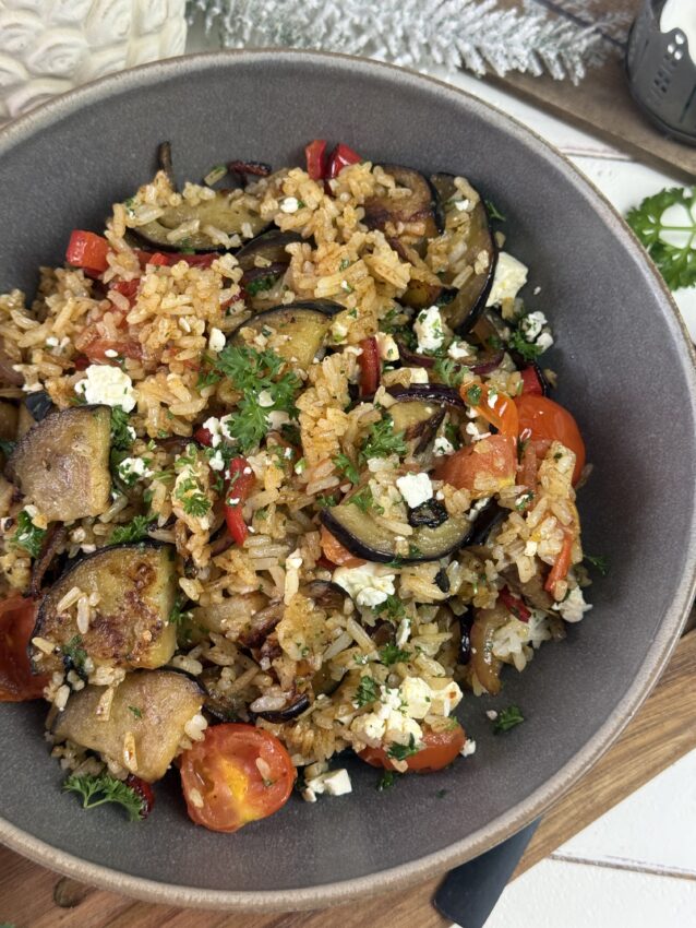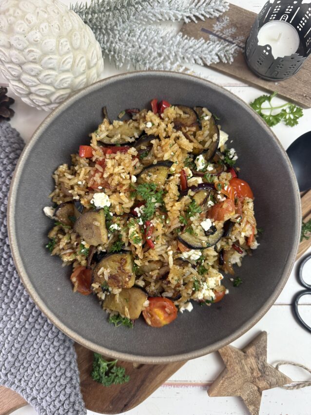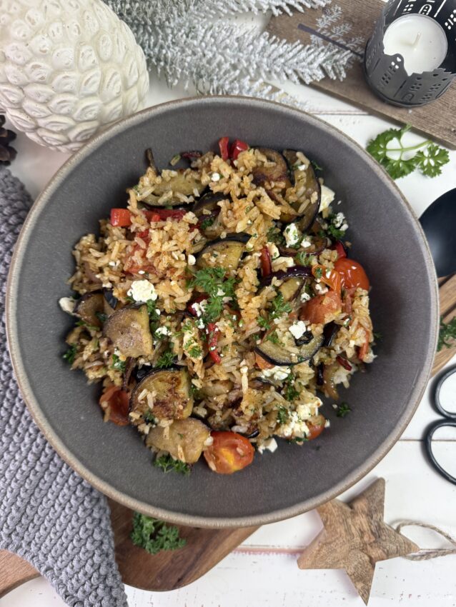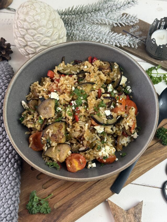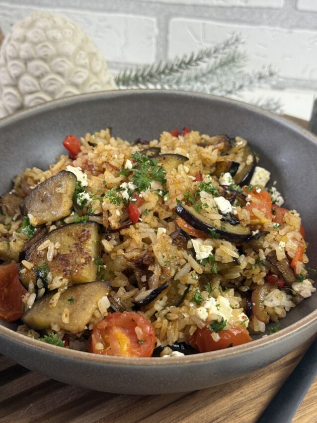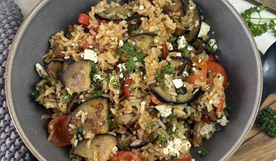 Goldbraun gebratene Auberginen, locker gekochter Reis, ein Hauch mediterraner Würze und zum Schluß cremiger Feta, der sanft zerbröselt darüber schmilzt.