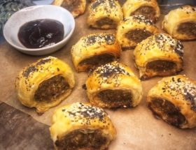 - Die Blätterteig-Rolle darauf legen und zu einem Kranz formen. Die aufgeschnittenen Stücke nach außen drehen und etwas flach drücken. Mit dem verquirlten Ei bestreichen und mit Sesam bestreuen.