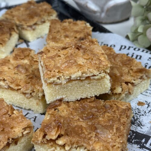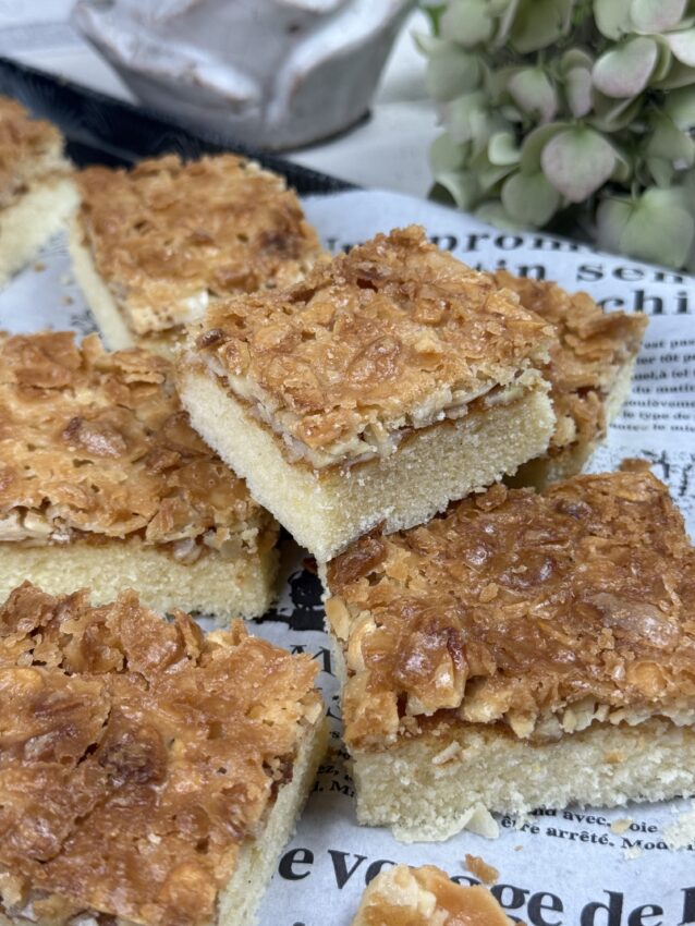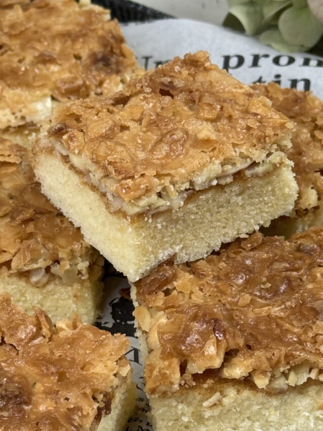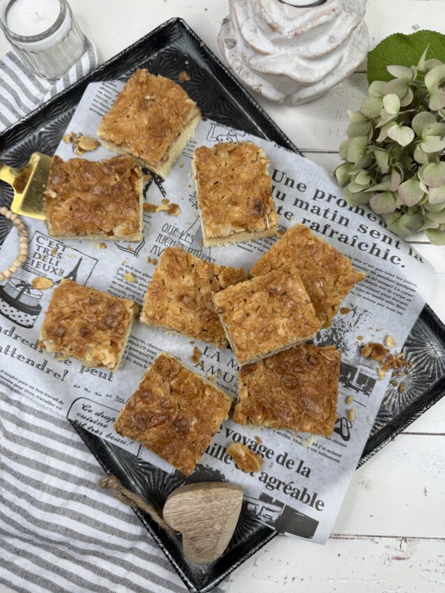 - Mandel-Topping auf den angebackenen Kuchen geben und nochmals 10-12 Minuten goldbraun backen.