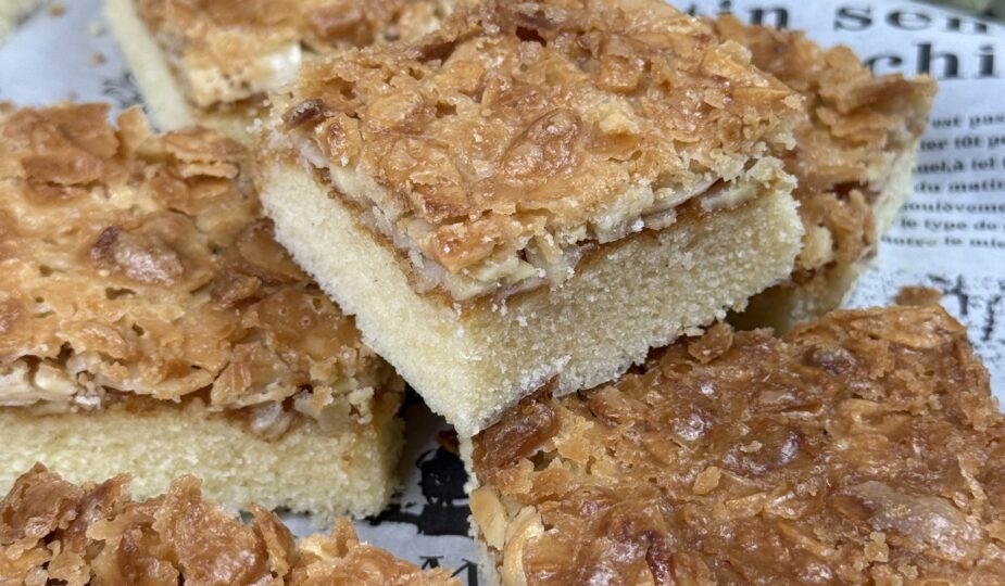 - Mandel-Topping auf den angebackenen Kuchen geben und nochmals 10-12 Minuten goldbraun backen.