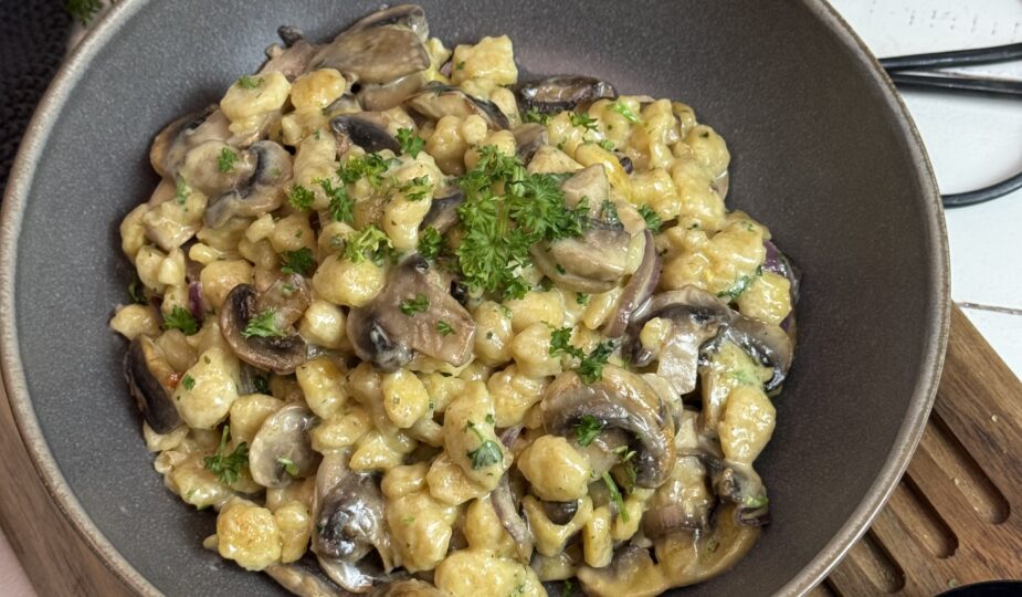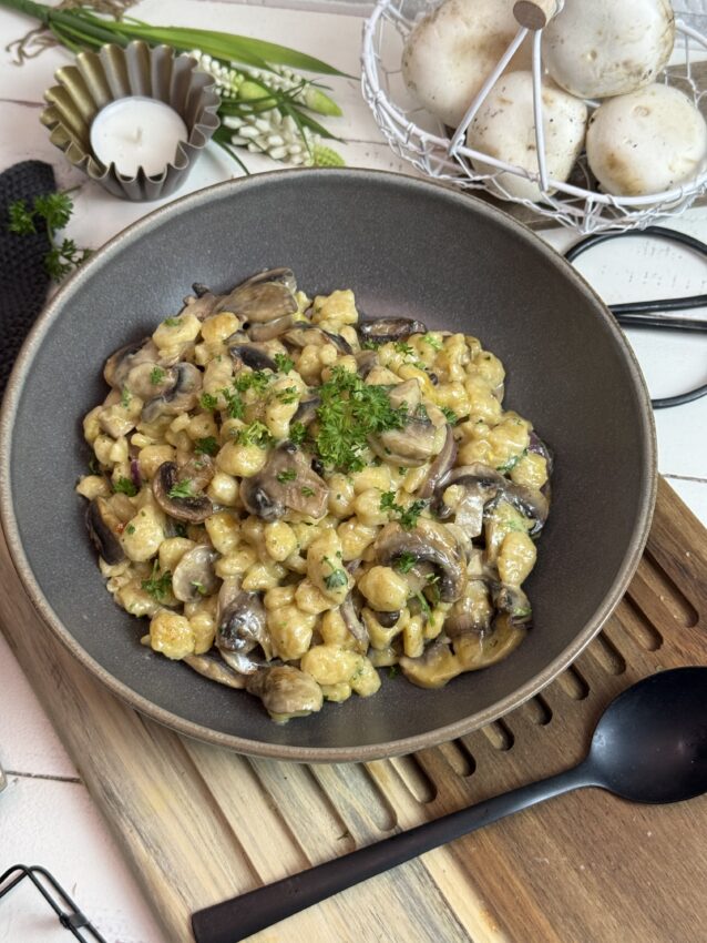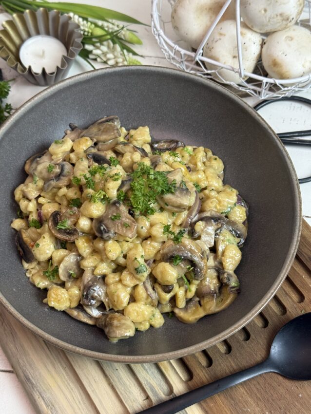 Zarte Champignons, goldene Knöpfle und eine cremige Sauce – verfeinert mit roten Zwiebeln und frischer Petersilie.