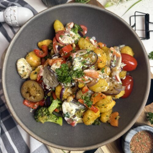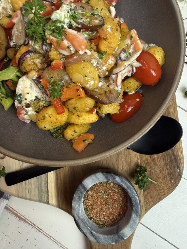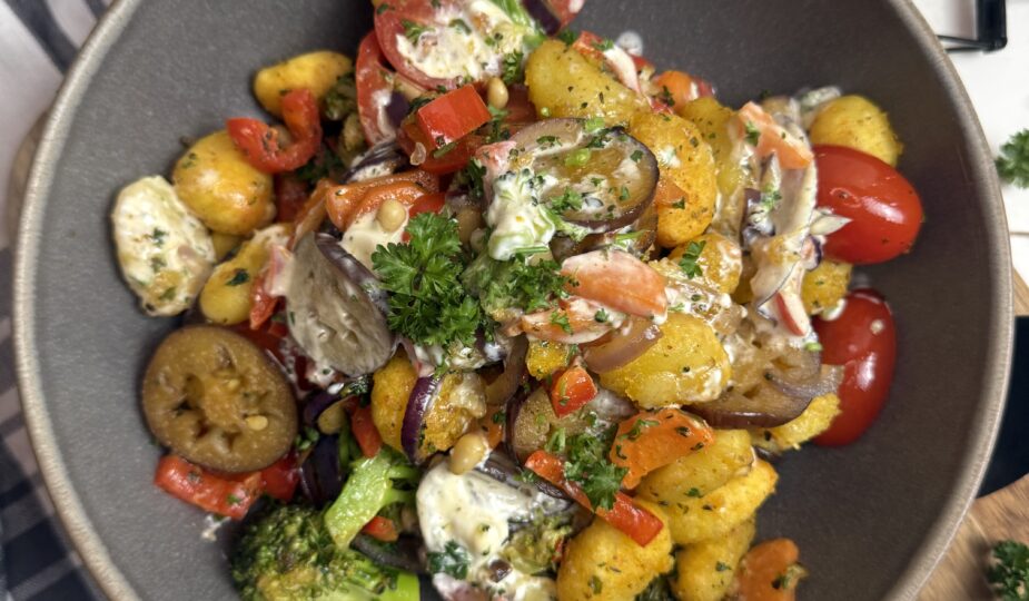 Brokkoli, Paprika, Aubergine und süße Tomaten schmoren langsam zusammen, begleitet von knusprigen Gnocchi – und am Ende verbindet alles ein Hauch Pfannenglück.