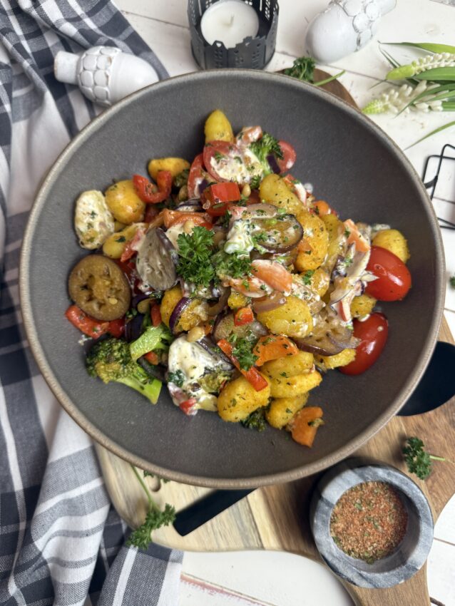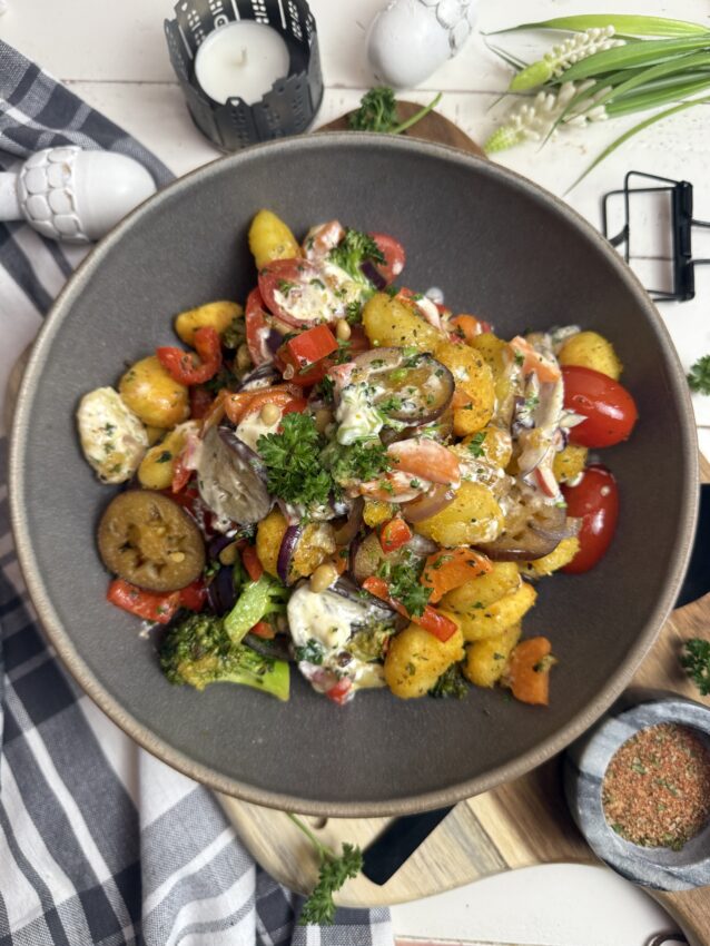 Eine Pfanne, buntes Gemüse, goldene Gnocchi und ein Löffel Cremigkeit – fertig ist das Pfannenglück.