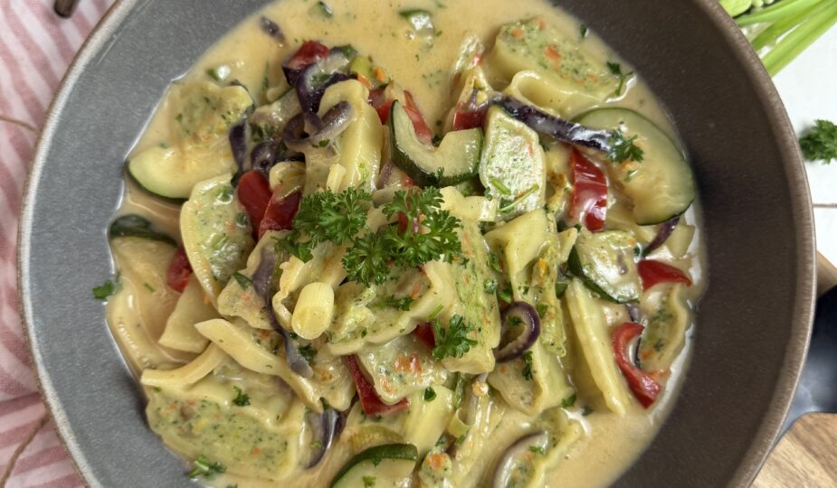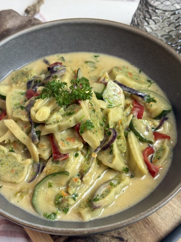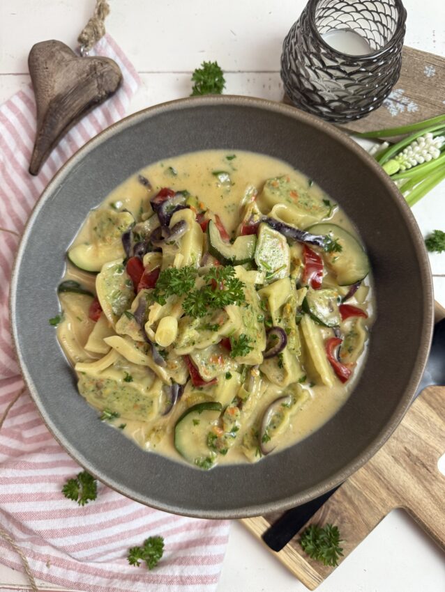 Wenn schwäbische Küche auf Curry trifft – dieses Gemüse-Maultaschen-Curry ist echtes Wohlfühlessen: cremig, würzig, bunt – und in 20 Minuten auf dem Tisch.