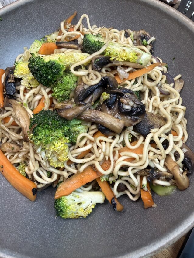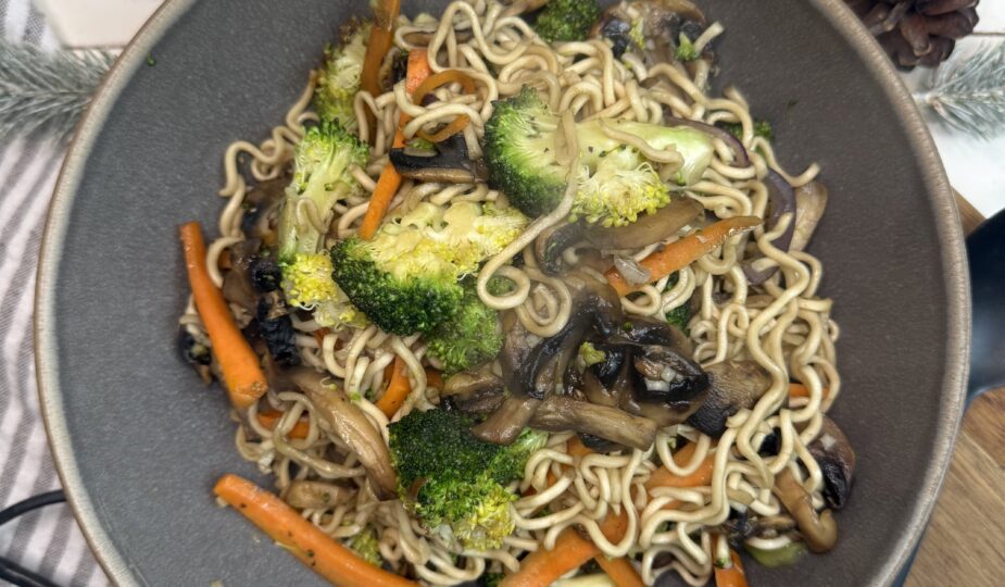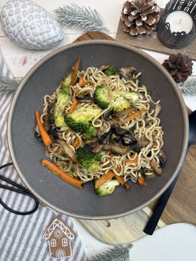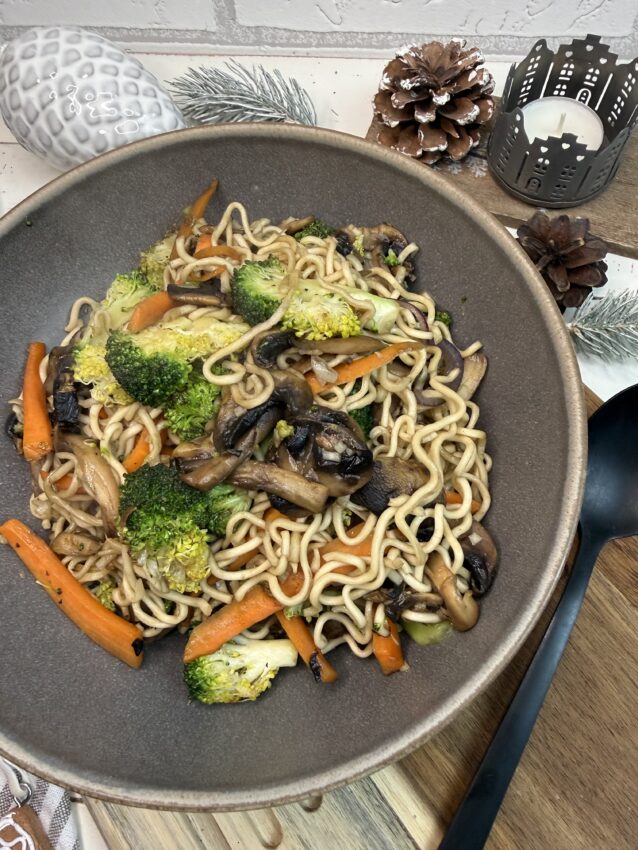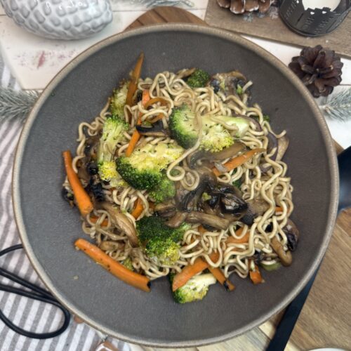 Frische Champignons, knackiger Brokkoli, feine Karottenstreifen und rote Zwiebeln treffen auf zarte Mie-Nudeln und eine aromatische Sojasauce. In Sesamöl gebraten entsteht ein wunderbar duftendes, leichtes Gericht – perfekt für den Feierabend oder wenn es schnell gehen darf.