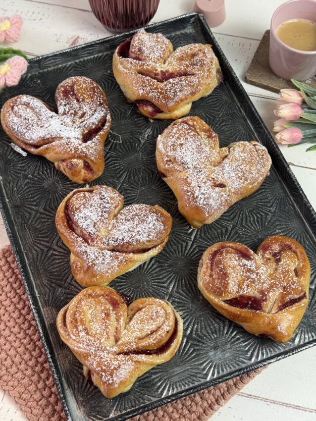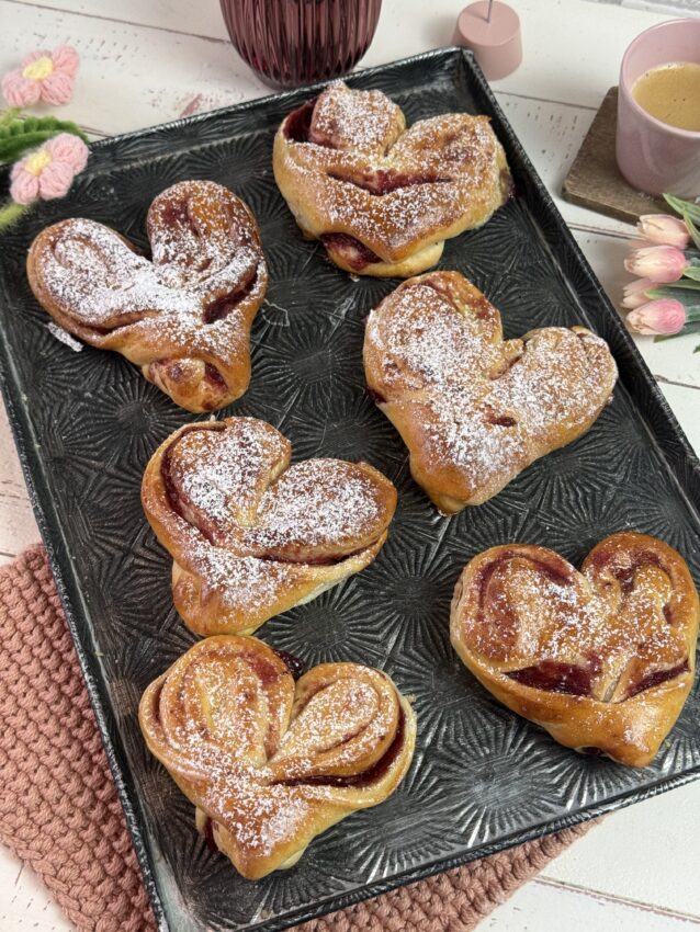 Hefe, Zeit und ein bisschen Liebe. Diese kleine Hefe-Herzen gefüllt mit Erdbeer-Marmelade sind mein Lieblingsrezept für den Valentinstag – goldbraun gebacken, noch leicht warm und einfach von Herzen gemacht für Menschen, die man gern hat.