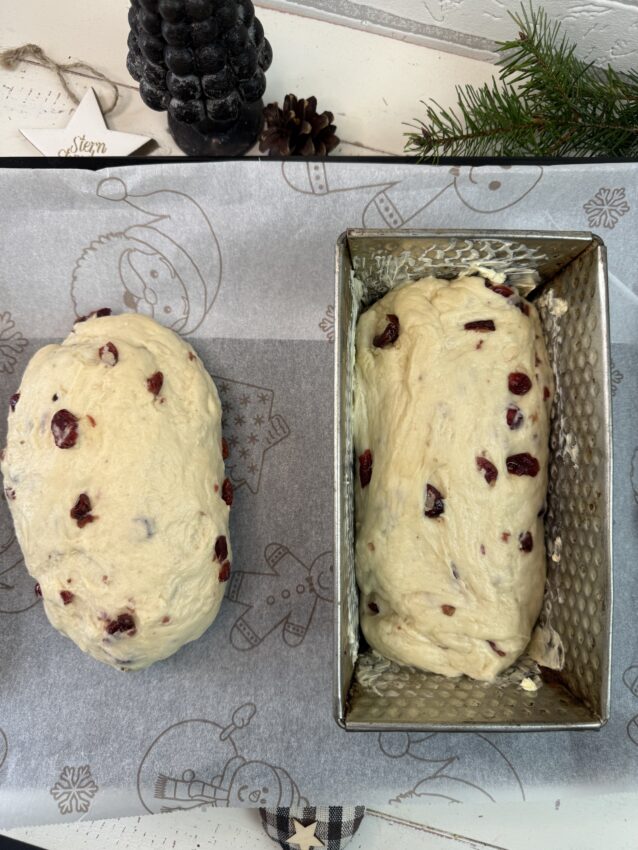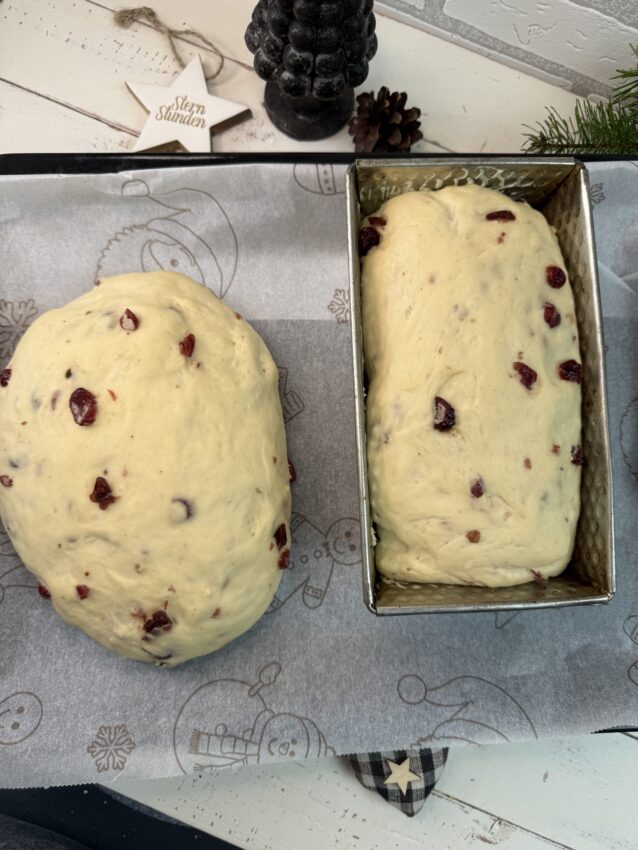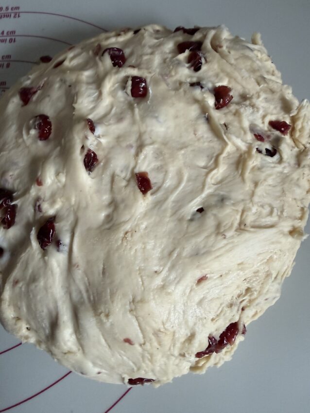 - Cranberries in Apfelsaft legen, das gerade so bedeckt ist, und sie ca. 15 Minuten ziehen lassen. Alle Zutaten für den Hefeteig, mit Ausnahme der Butter, in die Rührschüssel geben. Es wird Milch direkt aus dem Kühlschrank verwendet. Die Küchenmaschine mit dem Knethaken verwenden und den Teig auf niedriger Geschwindigkeit kneten. Gegebenenfalls mehr Milch hinzufügen, falls der Teig kompakt erscheint, oder etwas mehr Mehl, falls er locker erscheint. Danach den Teig ca. 10 Minuten bei mittlerer Geschwindigkeit kneten. Anschließend die Butter in kleinen Würfeln hinzufügen und kneten, bis der Teig die Ränder in der Rührschüssel loslässt und die gesamte Butter gut in den Teig eingearbeitet ist (nach weiteren 10 Minuten). Den Apfelsaft von den Cranberries abgießen, die überschüssige Flüssigkeit ausdrücken und die Cranberries in den letzten Sekunden in den Teig einkneten, bis sie einigermaßen gleichmäßig im Teig verteilt sind, aber nicht so lange, dass sie zerdrückt werden. Die Rührschüssel mit Plastik verkleiden oder einen Deckel aufsetzen und an einem zugfreien Ort stehen lassen. Den Teig auf etwa die doppelte Größe aufgehen lassen, was normalerweise ca. 1 ½ Stunden dauert. Falls keine Zeit vorhanden ist, den Teig so lange gehen zu lassen, kann die Milch auf ca. 20 Grad erwärmt werden, bevor sie zum Teig gegeben wird. Den Teig auf eine bemehlte Unterlage geben und in 2 gleich große Stücke teilen und zu großen Kugeln formen. Diese ca. 15 Minuten unter einem Tuch ruhen lassen (kann weggelassen werden), danach die Julebrød in die gewünschte Form bringen und auf ein mit Backpapier belegte Backbleche legen. Die Julebrød unter einem Tuch oder Plastik bis zur fast doppelten Größe nachgehen lassen. Das dauert ca. 1 Stunde. Die Brote mit verquirltem Ei bestreichen und Schnitte hineinschneiden. Die Julebrød auf der untersten Schiene bei 200 Grad (Ober- und Unterhitze) in 25–30 Minuten backen, bis die Brote eine schöne Farbe haben und durchgebacken sind und beim vorsichtigen Klopfen auf die Unterseite ein „hohles“ Geräusch abgeben. Die Backzeit gegen Ende beobachten. Sollte der Eindruck entstehen, dass die Julebrød oben etwas zu braun werden, kann ein Stück Backpapier über die Brote gelegt werden. Die Julebrød auf einem Rost abkühlen lassen und genießen