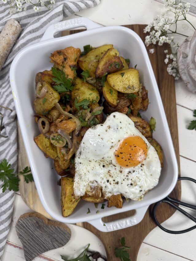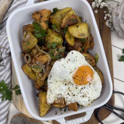 Es gibt Gerichte, die nach Wald, Wärme und Heimat schmecken – und genau so eine Pfifferling-Kartoffelpfanne ist für mich pures Herbstglück. Zarte, goldbraun gebratene Kartoffeln treffen auf aromatische Pfifferlinge. Dazu gesellen sich frische Petersilie und ein Hauch Knoblauch. So köstlich – pure Herbstliebe aus der Pfanne.
