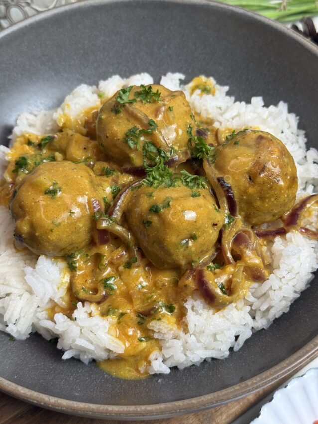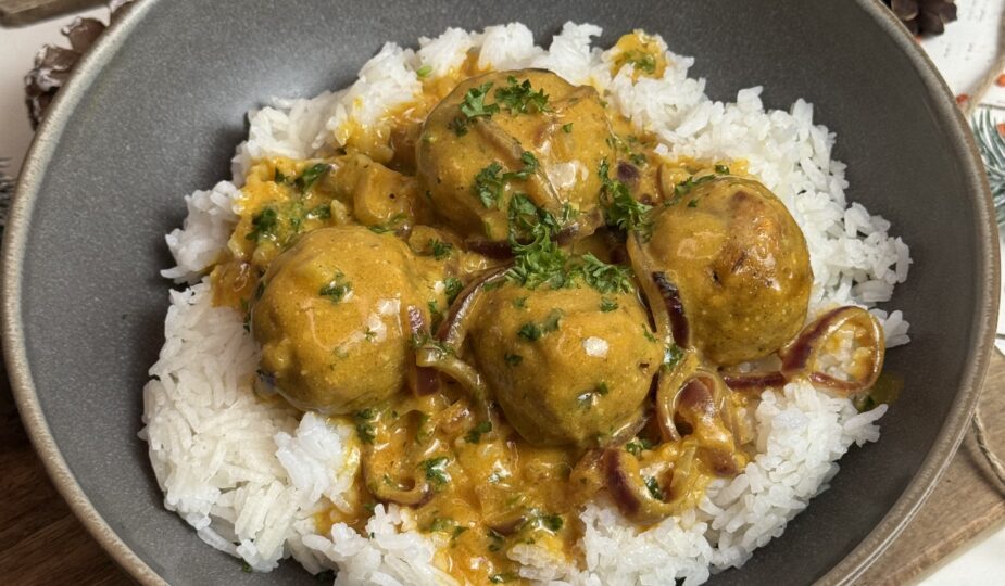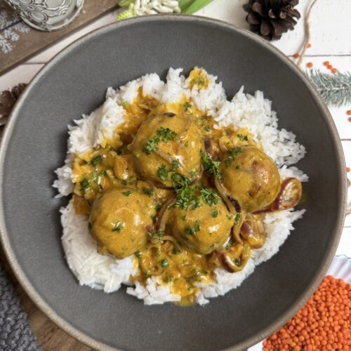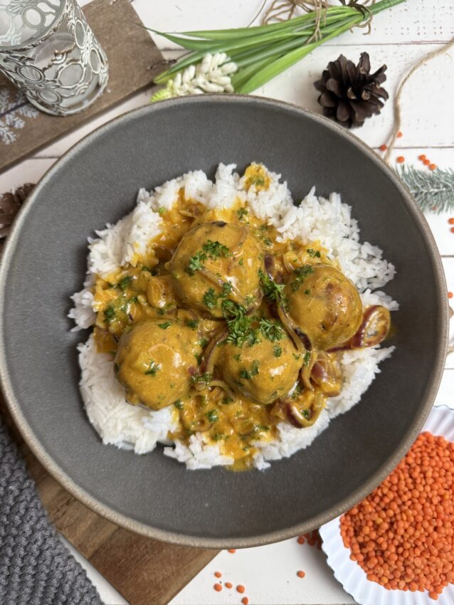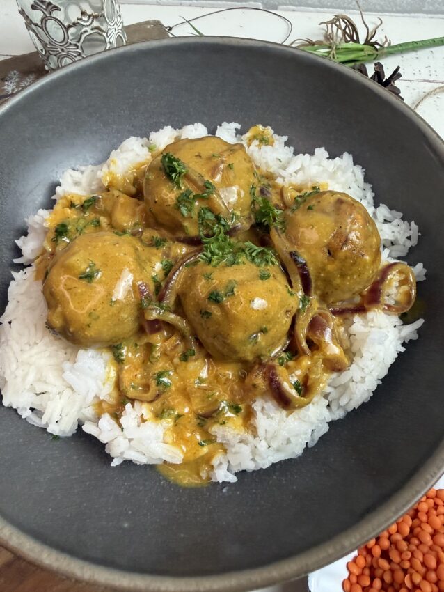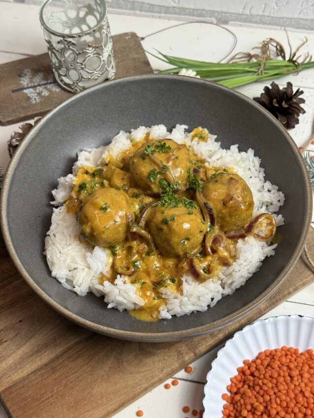 Goldbraun gebratene Linsenbällchen, außen leicht knusprig, innen wunderbar saftig – dazu eine sanfte Curry-Kokos-Sauce, die wärmt und glücklich macht.