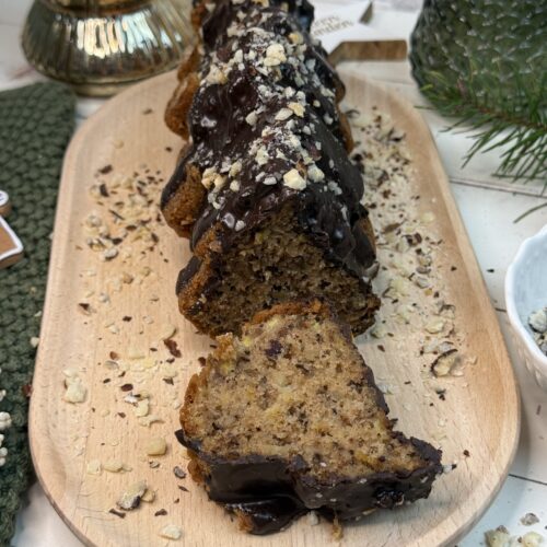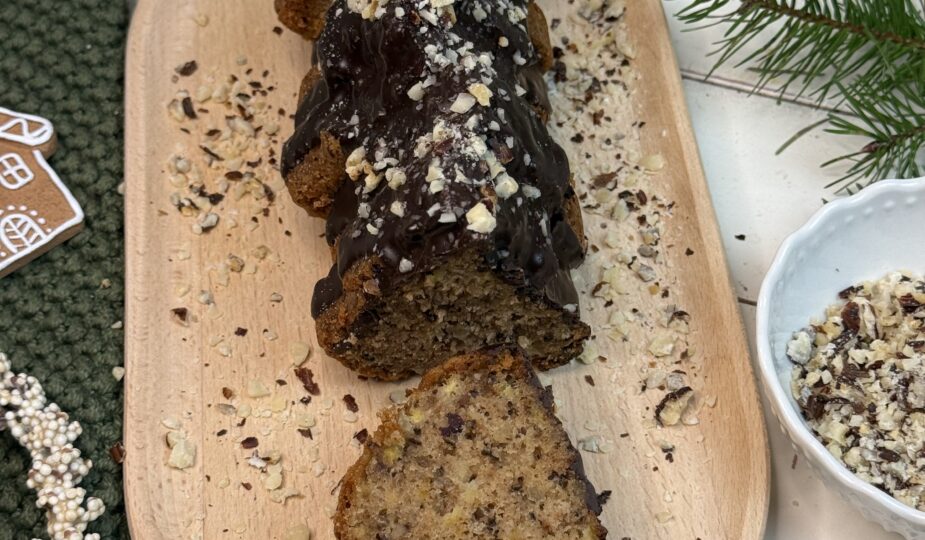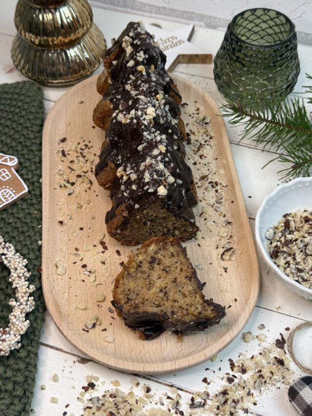 - Kuchen auskühlen lassen, dann aus der Form stürzen und mit Schokoglasur und gehackten Nüssen dekorieren.