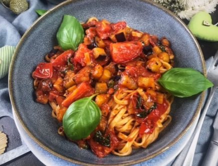 Cremiger Butternut-Kürbis mit Champignons und Bandnudeln