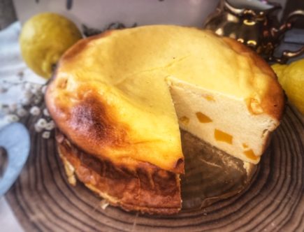 Cremiger Käsekuchen ohne Boden mit Pfirsichen