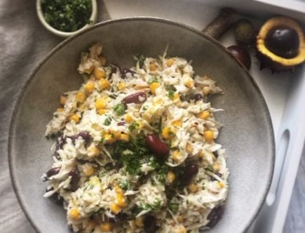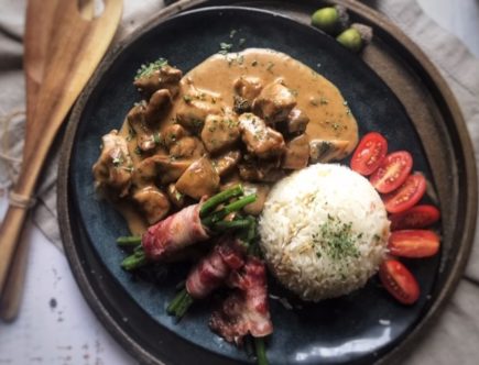 Putengulasch mit Champignons und Bohnen im Speckmantel