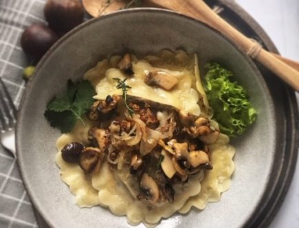 Kastanien-Birnen-Ravioli mit gebratenen Champignons und Walnüssen