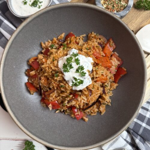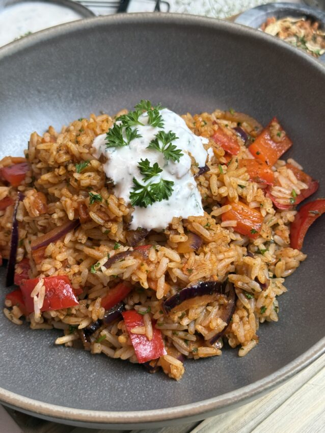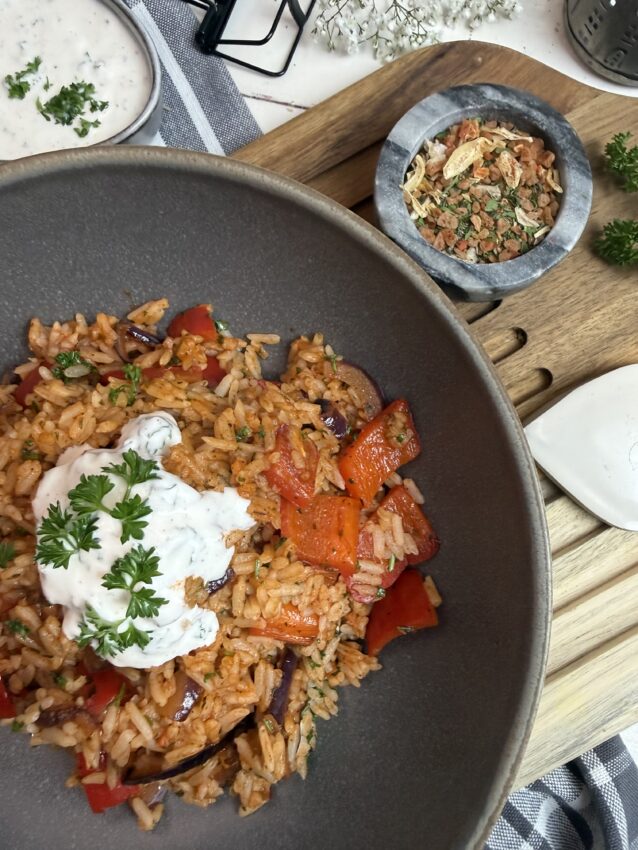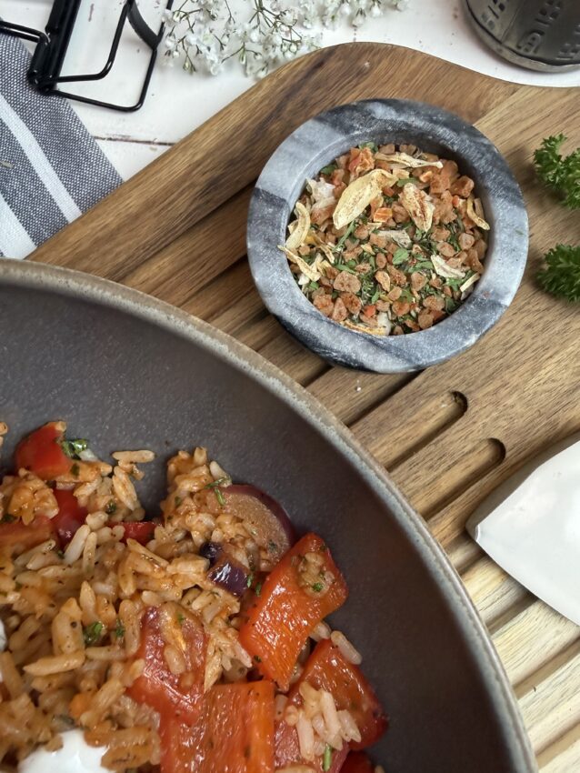 Für besonders viel Aroma habe ich diesmal mein „Gemüsefreude„-Gewürz von Gewürzwerke verwendet – das passt perfekt zu Paprika und Reis. Zum Gewürz: Gemüsefreude