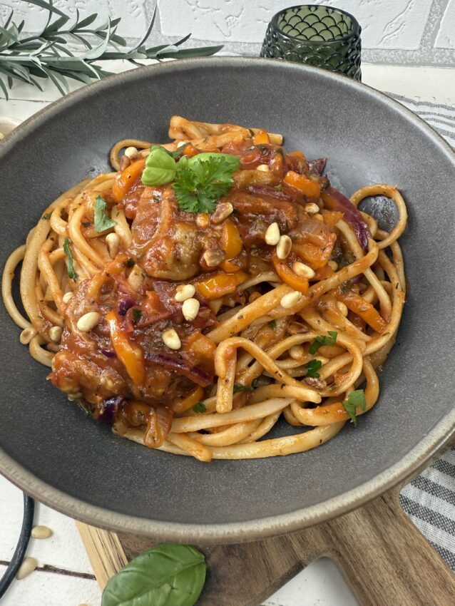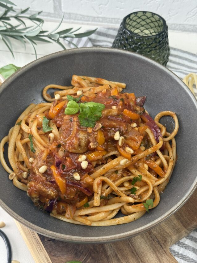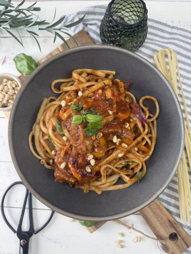 Geröstete Auberginen und Paprika treffen auf sonnengereifte Tomaten und feine Kräuter – ein Ragout, das nach Süden schmeckt und die Seele wärmt. Dazu frische Pasta, ein Hauch Olivenöl und frische Kräuter – und schon duftet die Küche nach Urlaub und Gemütlichkeit.