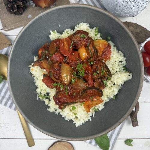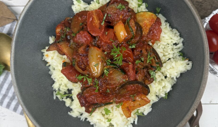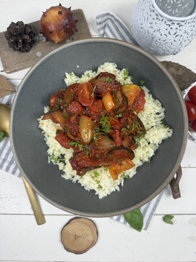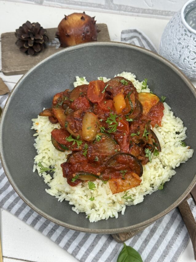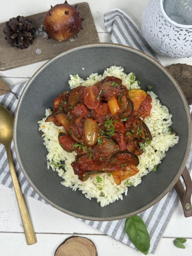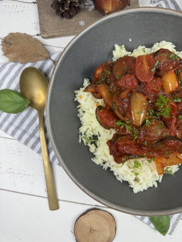 Ein Hauch von Provence in meiner Küche: buntes Ratatouille mit sonnengereiftem Gemüse, sanft geschmort und perfekt abgeschmeckt – dazu duftender Reis, der all die Aromen wunderbar aufnimmt. Ein einfaches, ehrliches Gericht, das nach Sommer schmeckt – einfach Soulfood bei dem kalten November-Wetter.