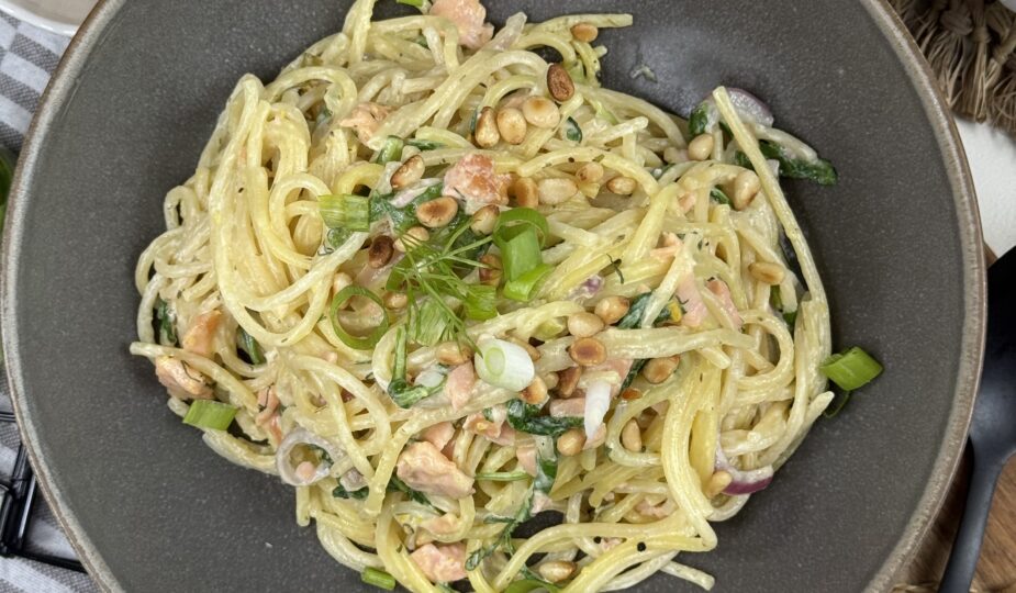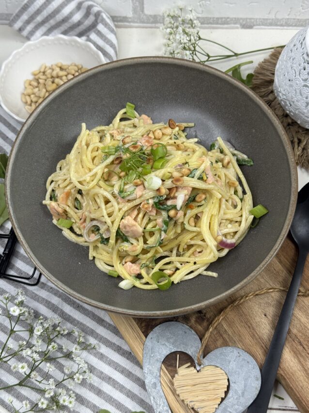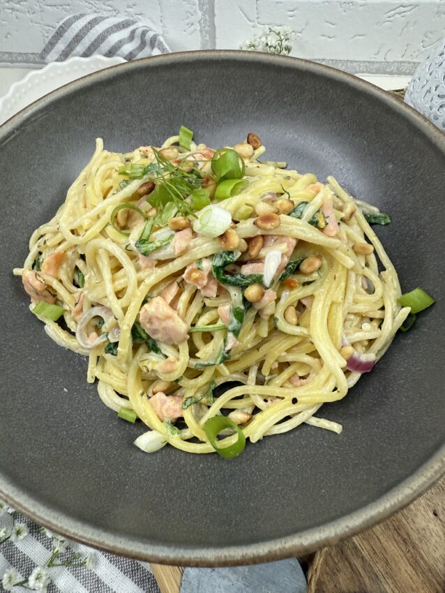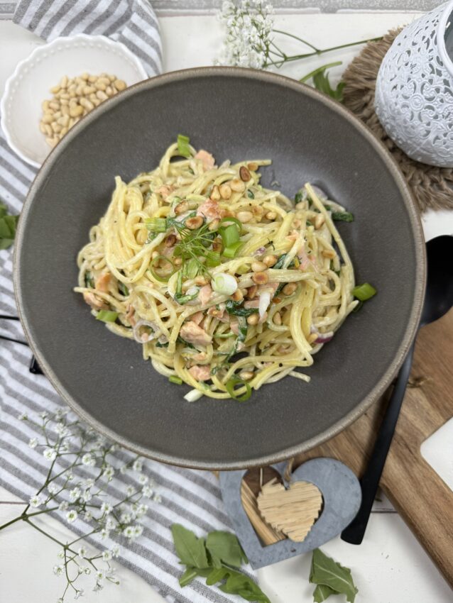 Pasta-Glück auf dem Teller. Spaghetti, cremige Sauce, feiner Räucherlachs und frischer Rukola – mehr braucht es nicht für ein schnelles Soulfood. Perfekt, wenn´s fix gehen soll und trotzdem besonders schmecken darf. Wer mag, noch etwas frisch gemahlenen Pfeffer und Zitronenzeste darüber -fertig ist das kleine Pastaglück.
