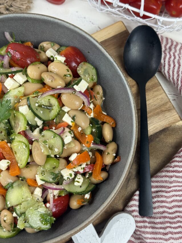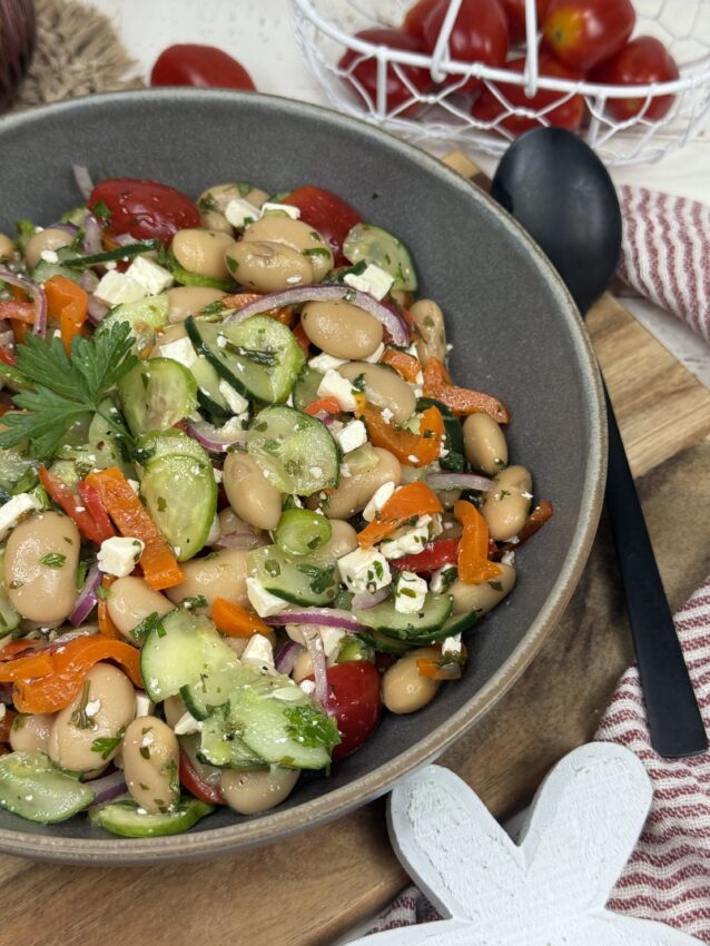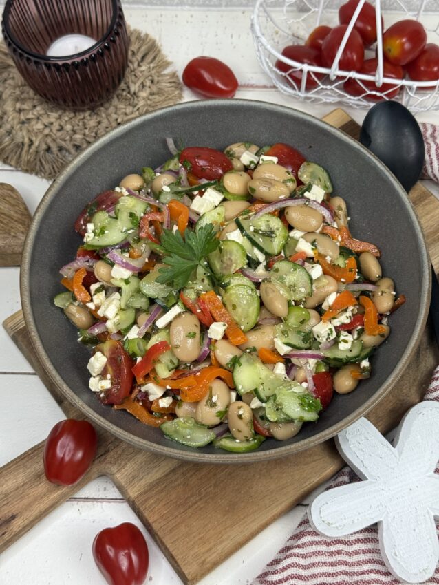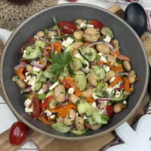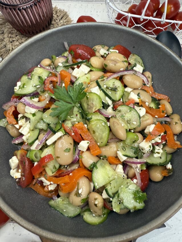 Weiße Bohnen treffen auf salzigen Feta, rote Zwiebeln, knackige Gurke, frisch gepressten Zitronensaft und gutes Olivenöl. Ein schneller Sommersalat, der satt macht und herrlich mediterran schmeckt. Perfekt zum Grillen, leichtes Mittagessen oder einfach so zwischendurch.