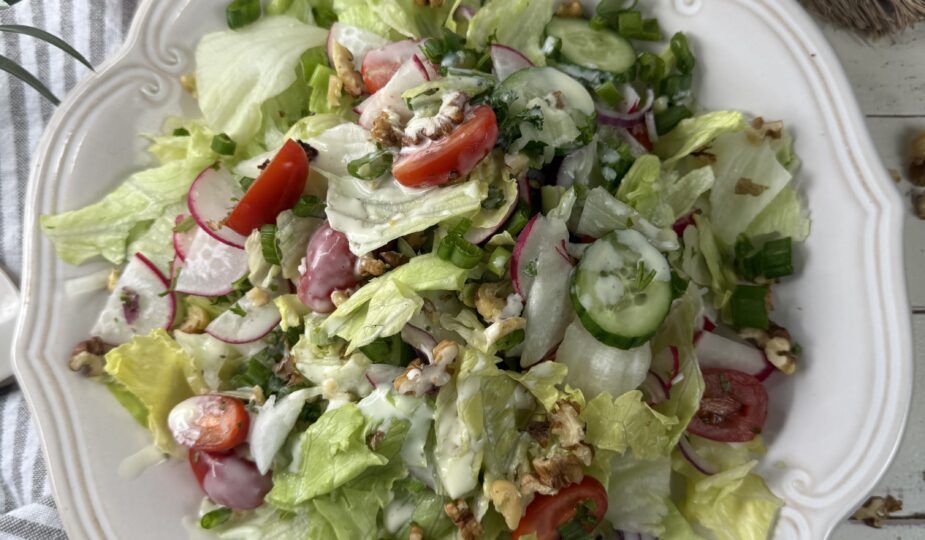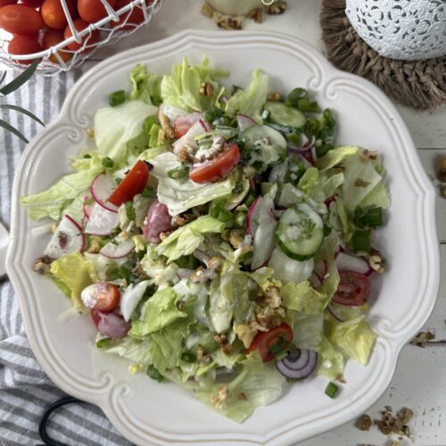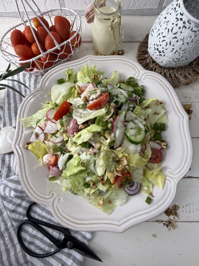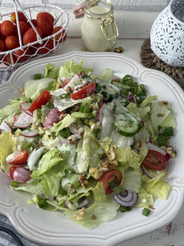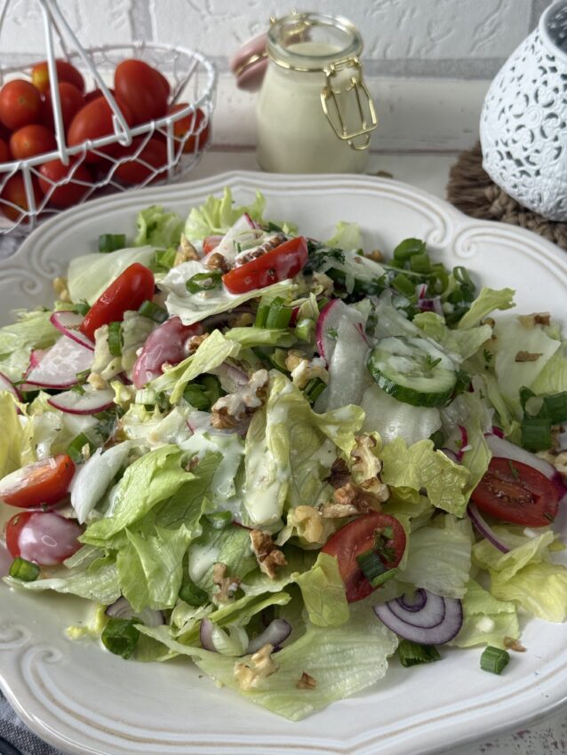 Frisch, knackig und sommerlich leicht – genau das Richtige für warme Tage ! Eisbergsalat trifft auf buntes Gemüse und ein cremiges Joghurt-Dressing mit Kräutern. Ein Genuss, der perfekt zu frischem Baguette und Gegrilltem passt.