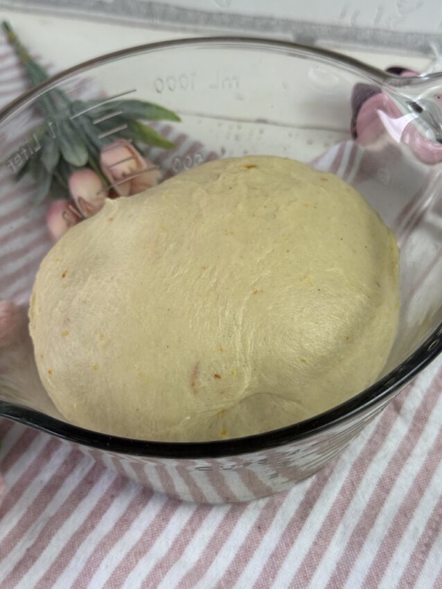 - Milch, Hefe, Salz und Zucker in eine Schüssel geben und die Hefe unter Rühren auflösen. Mehl in eine Schüssel geben, Abrieb der Orangen, Zimt und Hefemilch zugeben. Alles zu einem weichen Teig verkneten. Butter zugeben und alles weiterkneten. Teig ca. 10 Minuten kneten, bis er weich und glatt ist. Teig abdecken und 30 Minuten ruhen lassen.