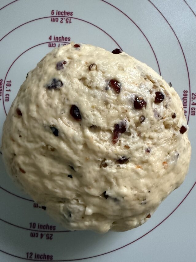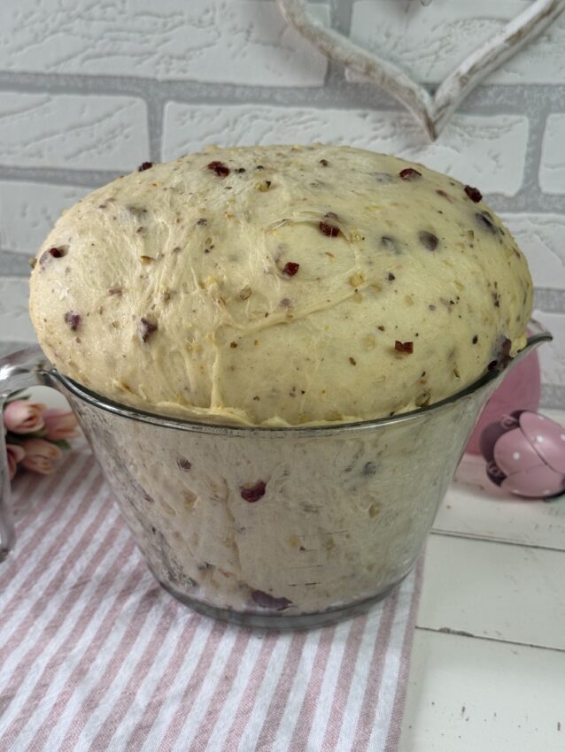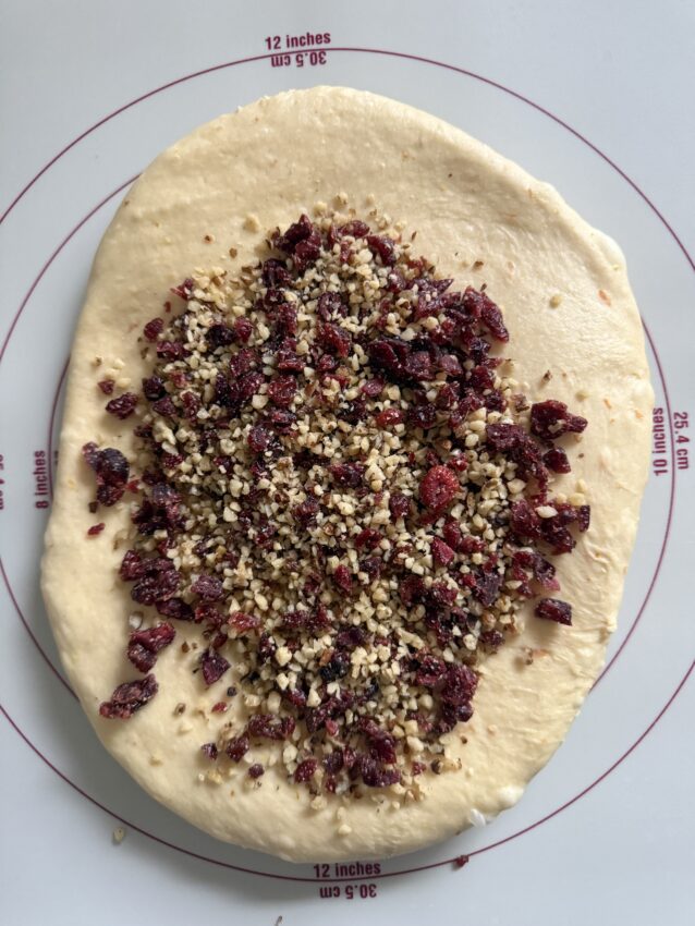 - Cranberries hacken, zusammen mit Haselnuss-Stücken zum Teig geben und unterkneten. Den Teig abdecken und 1,5 Stunden gehen lasen.