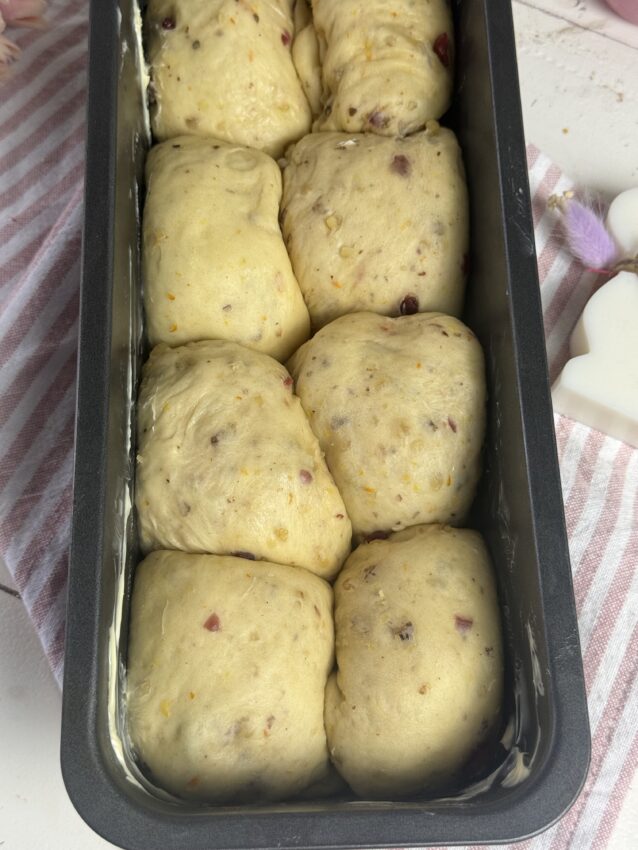 - Eine Kastenform vorbereiten und einfetten. Die Teigkugeln in die Form setzen, abdecken und nochmals 2 Stunden gehen lassen.