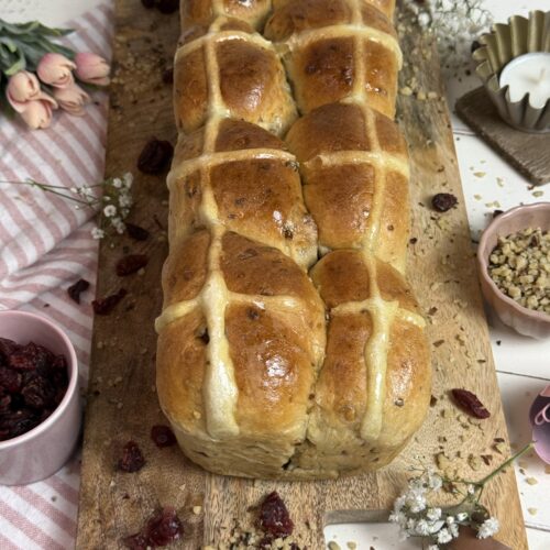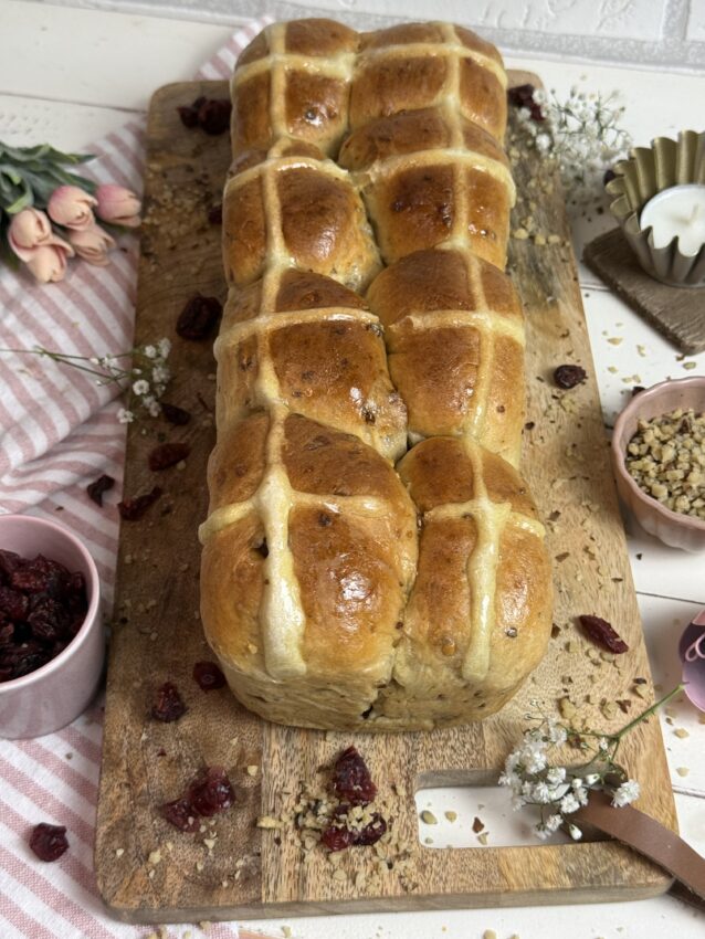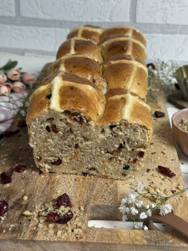 Ein weiches Hefebrot mit Cranberries, Orangenschale und feinen Haselnssstücken – goldbraun gebacken und mit den typischen Kreuzen verziert.
