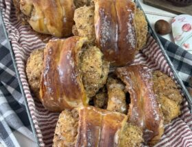 - Den Hefeteig auf der bemehlten Arbeitsfläche rechteckig ( ca. 20×30 cm ) ausrollen. Die Nussfüllung daraufstreichen und verteilen. Den Teig von unten noch oben einklappen und festdrücken. Teig in ca. 4 cm breite Streifen schneiden. Jeden Streifen mit einem Schlitz in der Mitte versehen. Den Teig auf der oberen Seite von oben nach unten durch den Schlitz ziehen. Den Teig von der unteren Seite von unten nach oben durch den Schlitz ziehen.