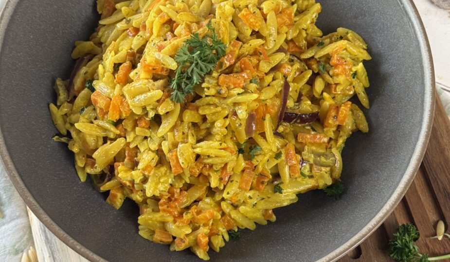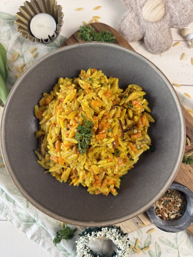 Heute gibt es schnelle Wohlfühlküche aus einem Topf. Dieses One Pot Orzo mit Karotten ist cremig, aromatisch und perfekt für Tage, an denen es unkompliziert sein darf. Mein Gewürz „Gemüsefreude“ bringt eine schöne Kräuternote und passt perfekt zu Gemüsegerichten wie diesem.