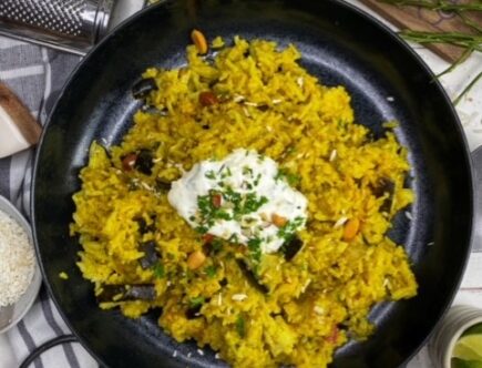 Gebratener Reis mit Aubergine und Joghurt-Dip