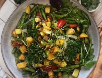 Grüner Bohnensalat mit Tomaten, Kartoffel- und Zucchiniwürfeln